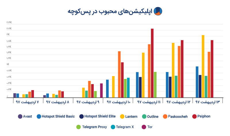 در روزهای پس از فیلترینگ تلگرام، آمار پسکوچه افزایش ۱۰۰ برابری دانلود فیلترشکن را نشان میدهد. همچنین دانلود روزانهی اپلیکیشنها نشان میدهد که برای چند روزی، اپلیکیشن اندروید پسکوچه مقام اول دانلود را به دست آورد و تعداد دانلود آن از فیلترشکن سایفون هم بالاتر رفت. سپس فیلترشکنهای سایفون و لنترن دوباره به ابتدای لیست دانلود توسط کاربران ایران رفتند.