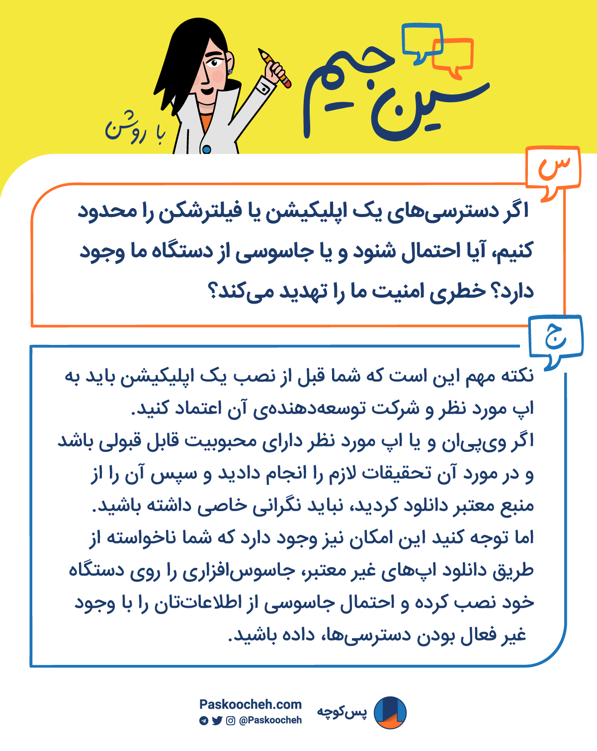 سینجیم ۴۱: اگر دسترسیهای یک اپلیکیشن یا فیلترشکن را محدود کنیم، آیا احتمال شنود و یا جاسوسی از دستگاه ما وجود دارد؟ خطری امنیت ما را تهدید میکند؟