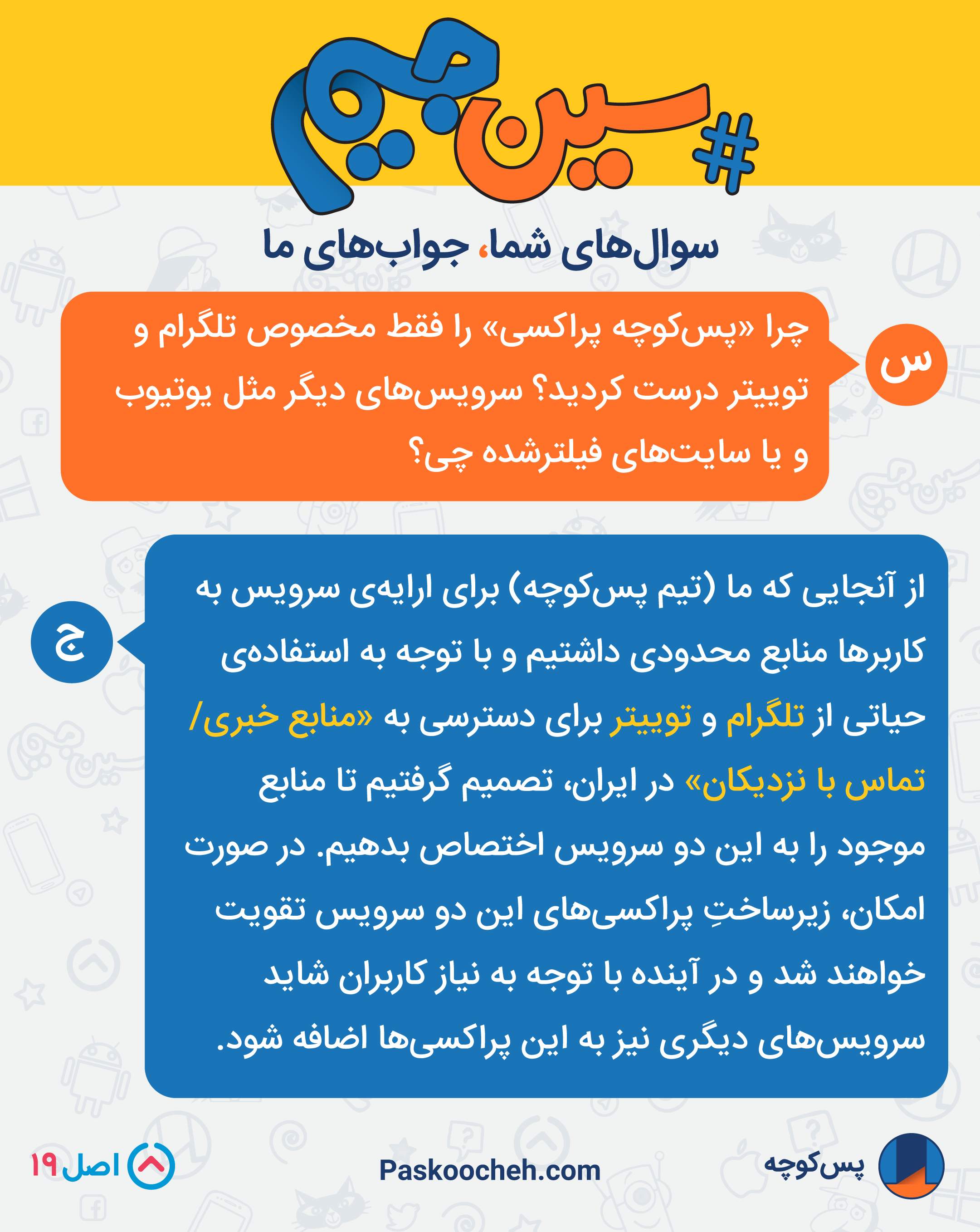 - سینجیم۹: چرا «پسکوچه پراکسی» را فقط مخصوص تلگرام و توییتر درست کردید؟ سرویسهای دیگر مثل یوتیوب و یا سایتهای فیلترشده چی؟