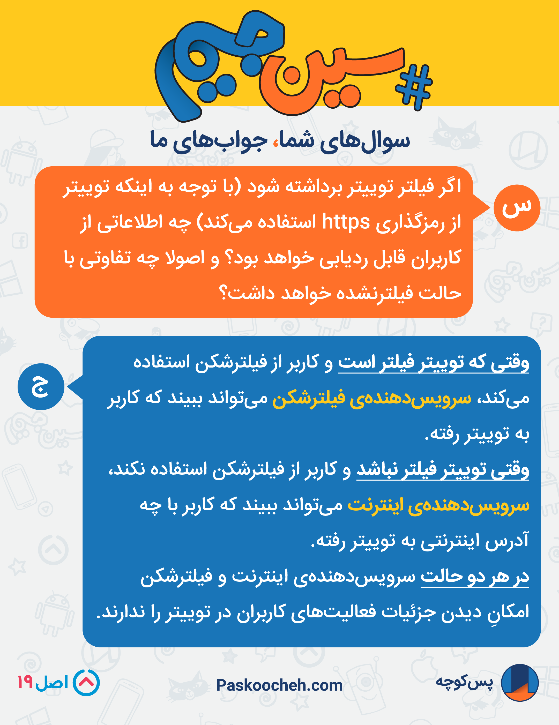 - سینجیم۸: اگر فیلتر توییتر برداشته شود (با توجه به اینکه توییتر از رمزگذاری https استفاده میکند) چه اطلاعاتی از کاربران قابل ردیابی خواهد بود؟ و اصولا چه تفاوتی با حالت فیلترنشده خواهد داشت؟