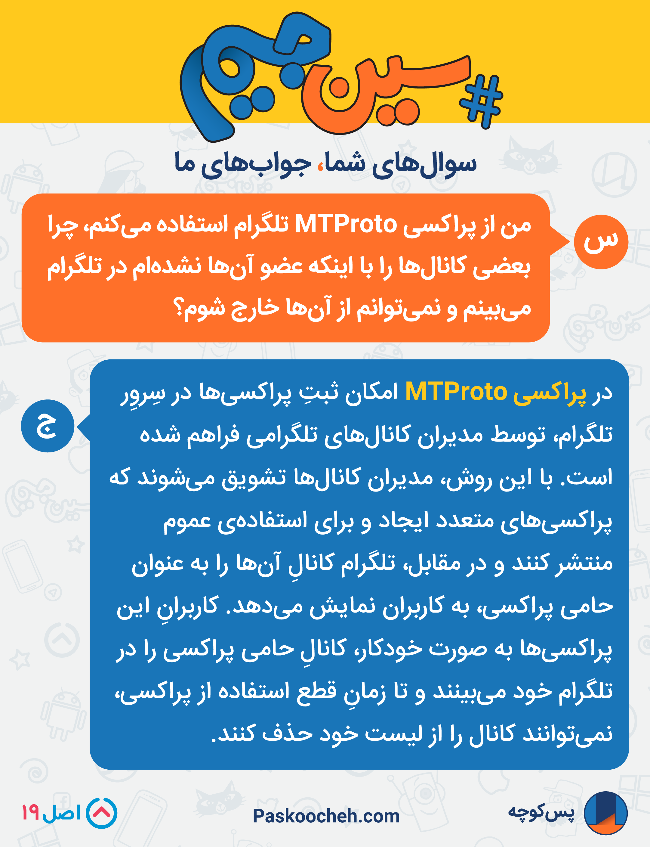 - سینجیم۱۱: من از پراکسی MTProto استفاده میکنم، چرا بعضی کانالها را با اینکه عضو آنها نشدهام در تلگرام میبینم و نمیتوانم از آنها خارج شوم؟