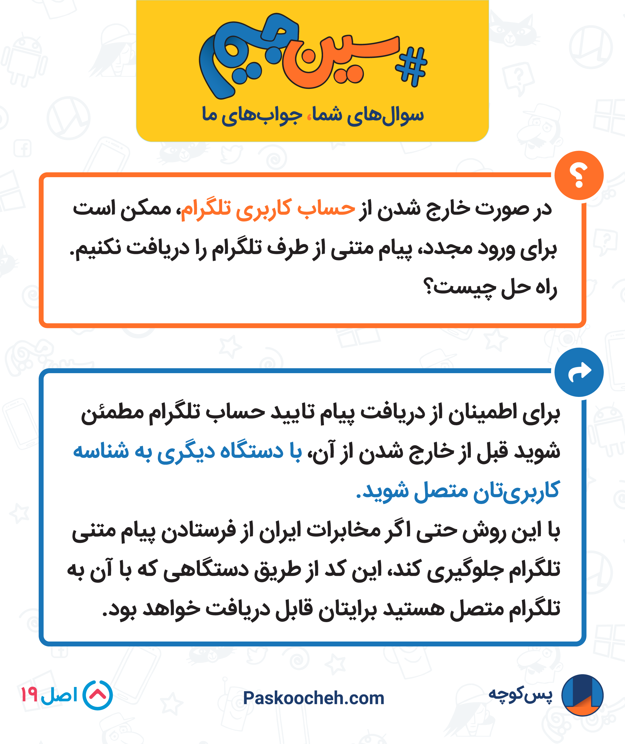 - سینجیم۱۷: در صورت خارج شدن از حساب کاربری تلگرام، ممکن است برای ورود مجدد، پیام متنی از طرف تلگرام را دریافت نکنیم. راه حل چیست؟
