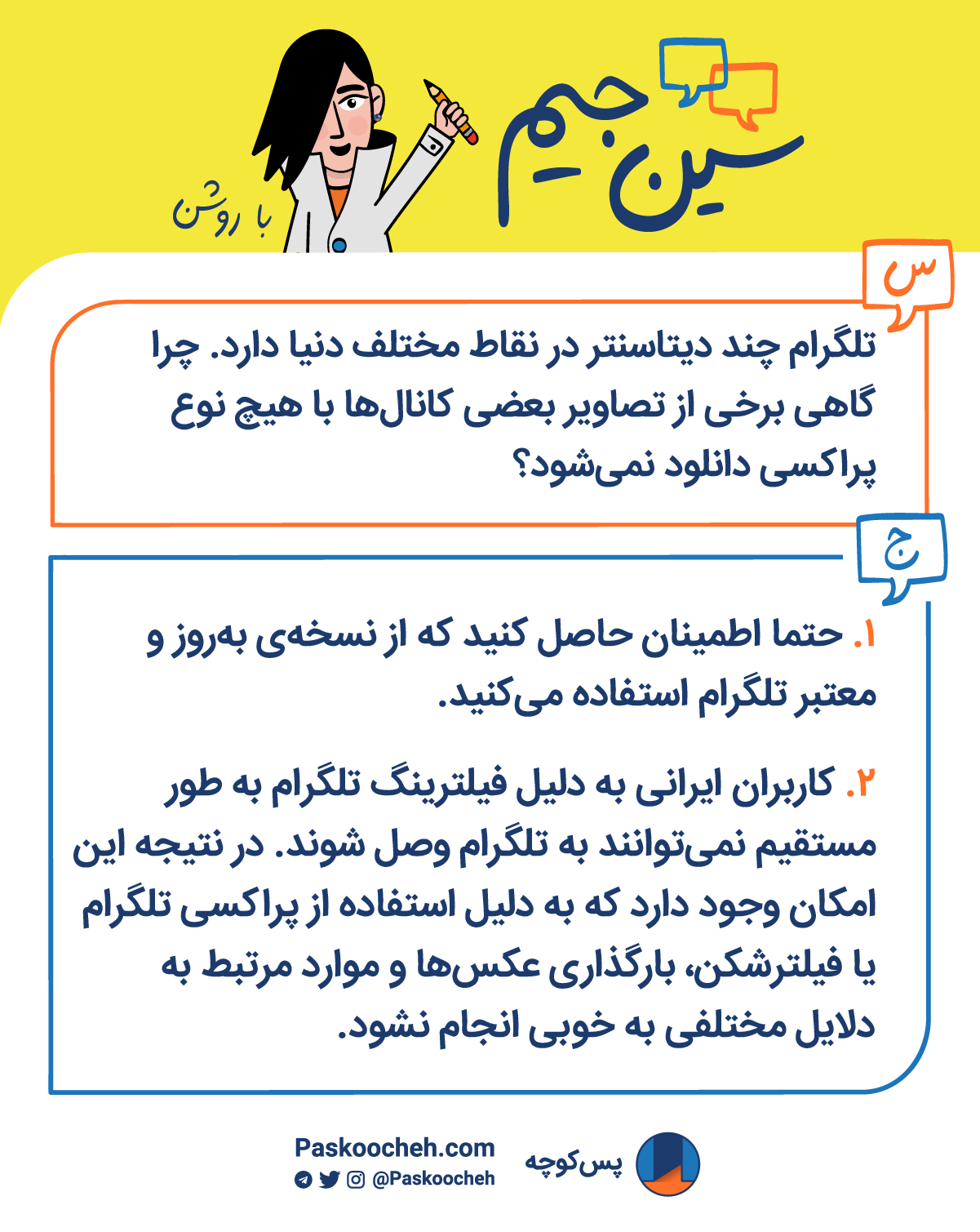 - سینجیم۴۵: تلگرام چند دیتاسنتر در نقاط مختلف دنیا دارد. چرا گاهی برخی از تصاویر بعضی کانالها با هیچ نوع پراکسی دانلود نمیشود؟