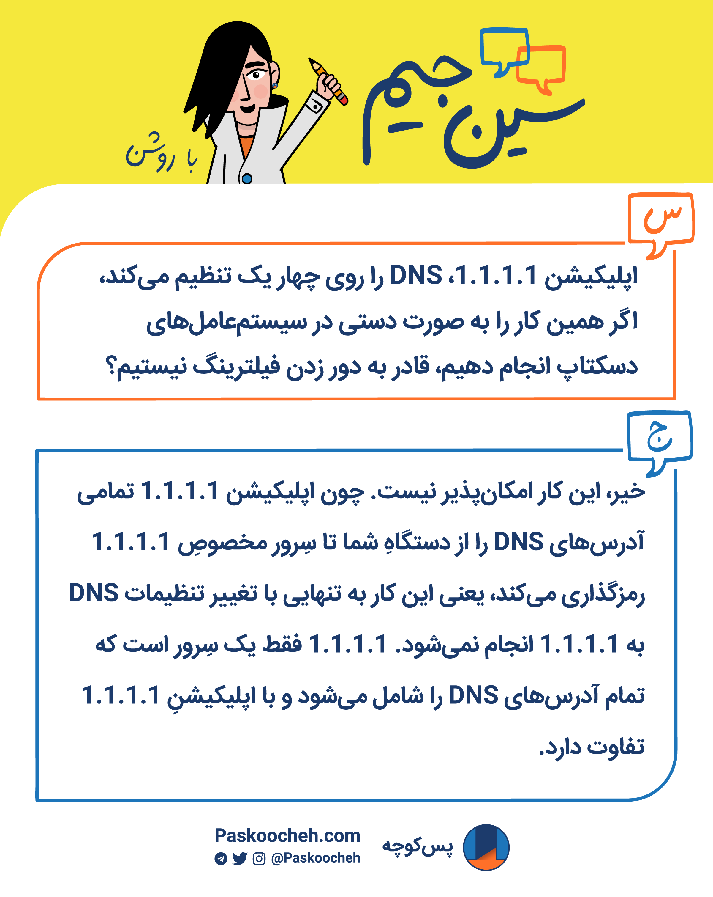 سینجیم ۳۱: اپلیکیشن ۱.۱.۱.۱، DNS را روی چهار یک تنظیم میکند، اگر همین کار را به صورت دستی در سیستمعاملهای دسکتاپ انجام دهیم، قادر به دور زدن فیلترینگ نیستیم؟