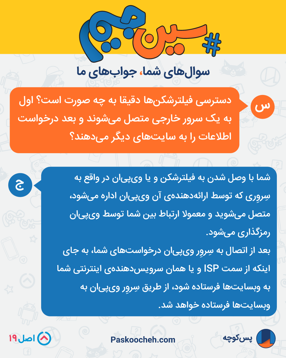 - سینجیم۴: دسترسی فیلترشکنها دقیقا به چه صورت است؟ اول به یک سرور خارجی متصل میشوند و بعد درخواست اطلاعات را به سایتهای دیگر میدهند؟
