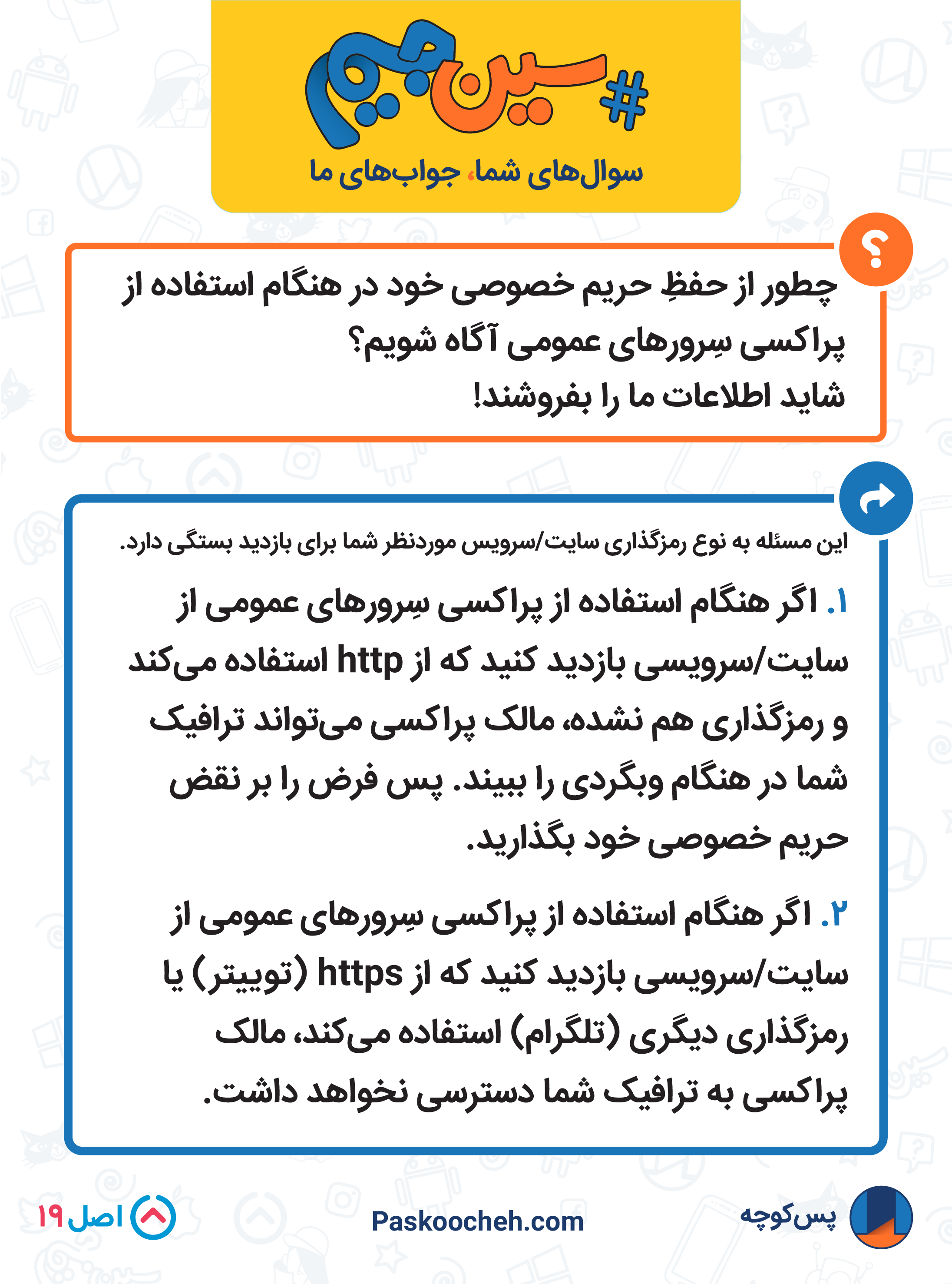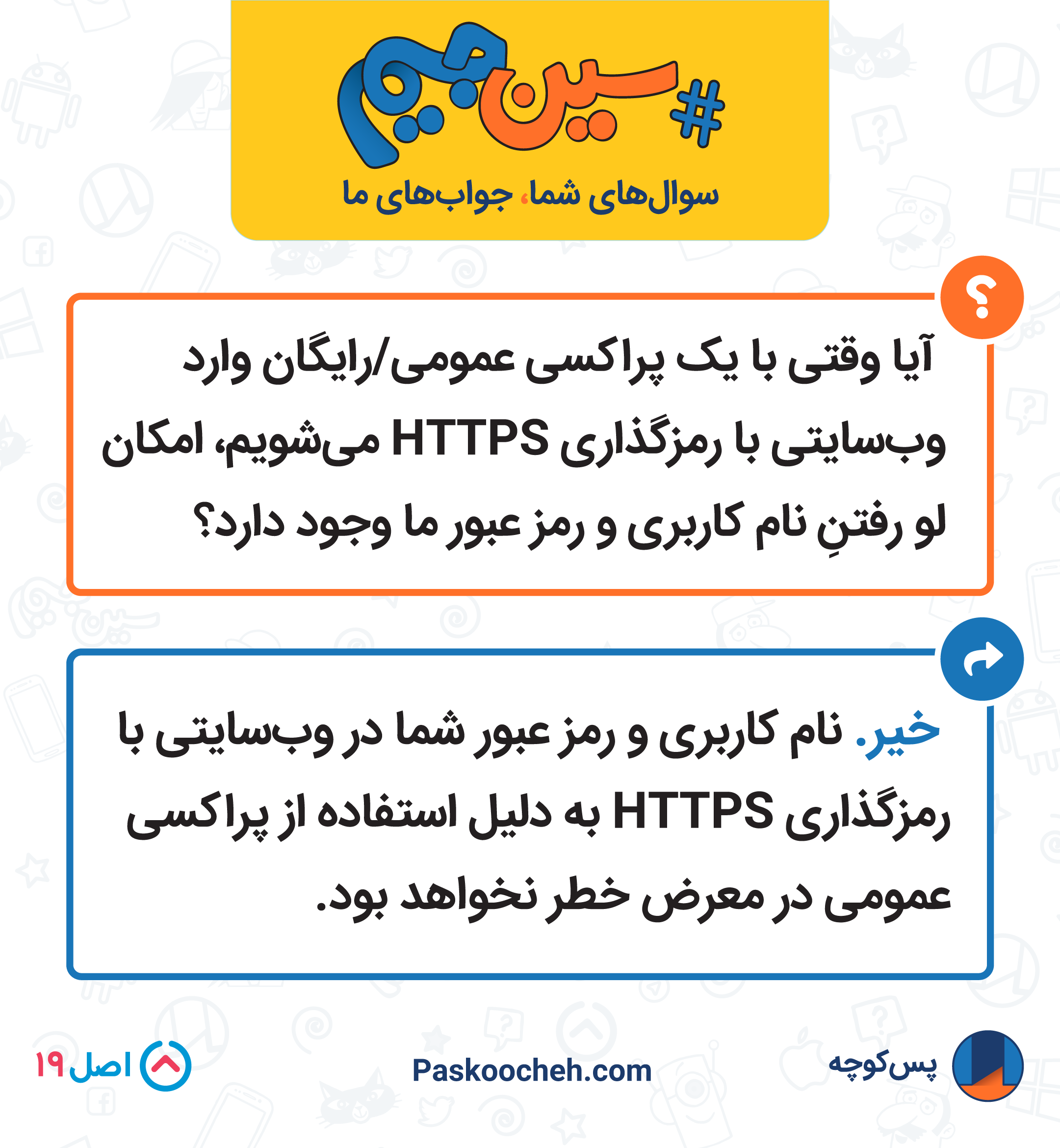 - سینجیم۲۸: آیا وقتی با یک پراکسی عمومی/رایگان وارد وبسایتی با رمزگذاری HTTPS میشویم، امکان لو رفتنِ نام کاربری و رمز عبور ما وجود دارد؟