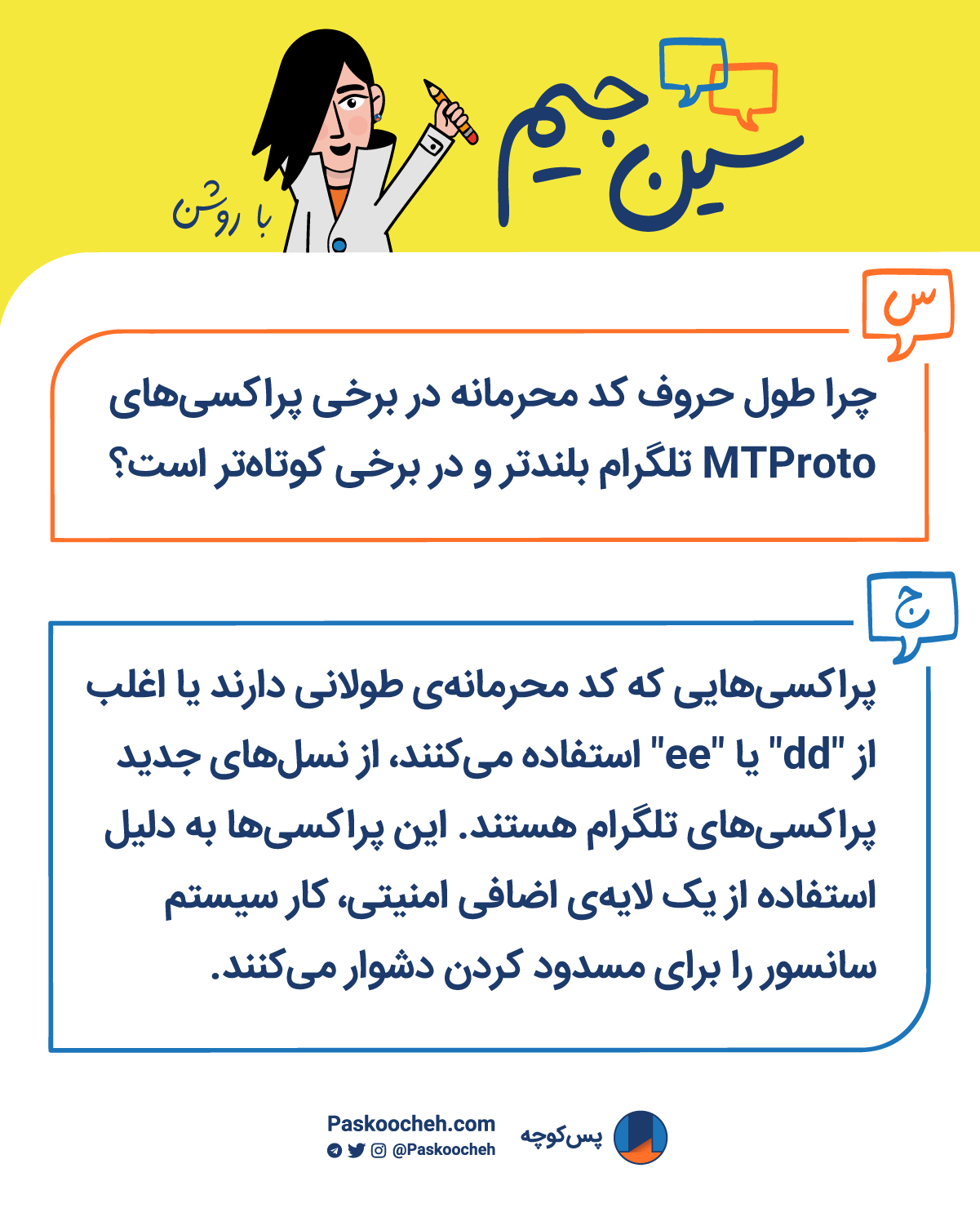 - سینجیم۴۳: چرا طول حروف کد محرمانه در برخی پراکسیهای MTProto تلگرام بلندتر و در برخی کوتاهتر است؟