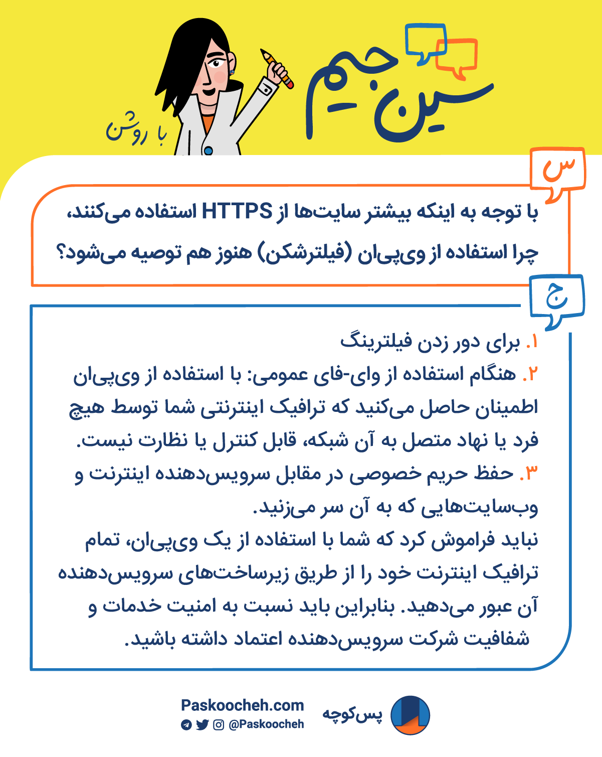 - سینجیم۴۴: با توجه به اینکه بیشتر سایتها از HTTPS استفاده میکنند، چرا استفاده از ویپیان (فیلترشکن) هنوز هم توصیه میشود؟