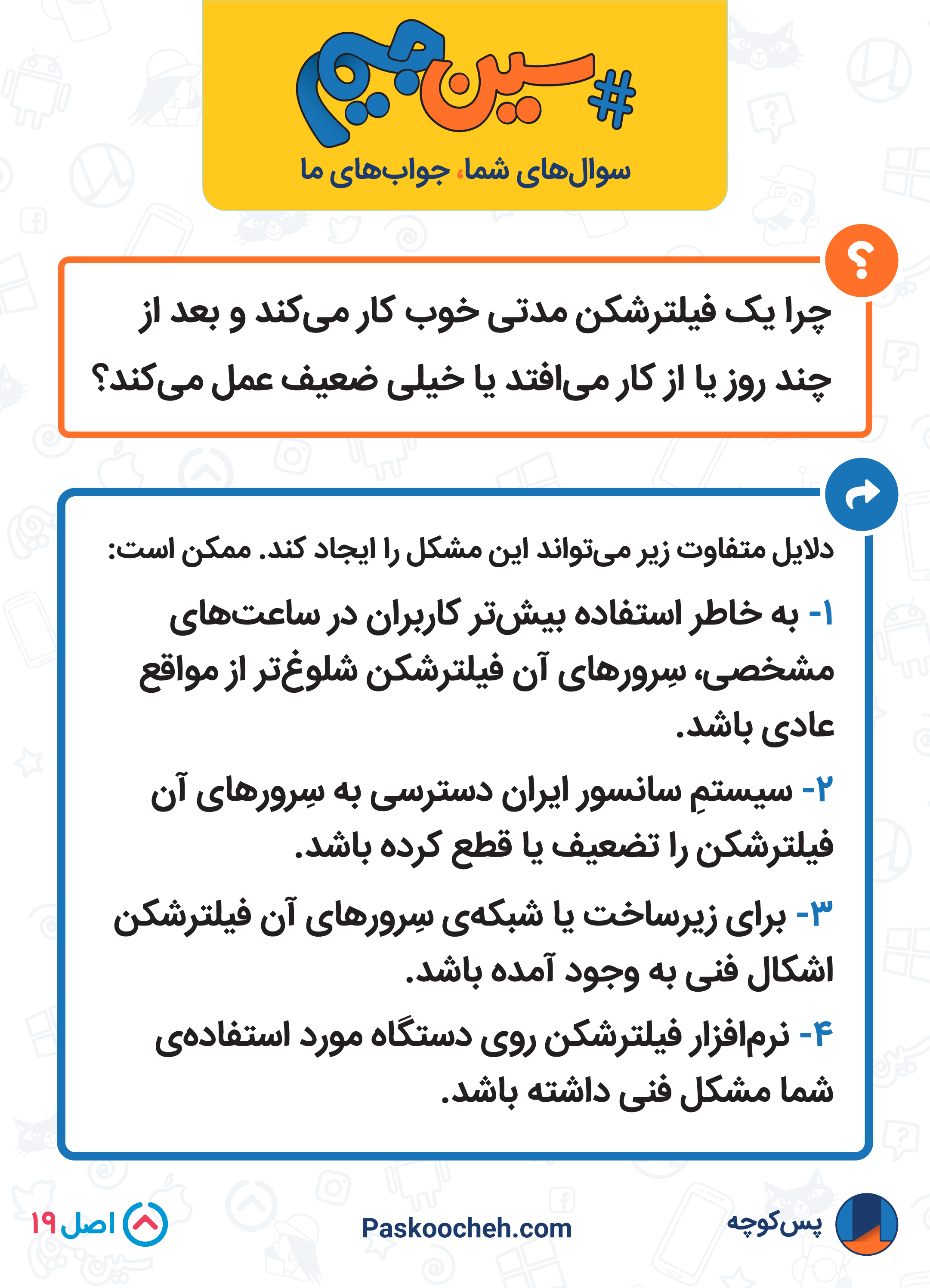 - سینجیم۲۲: چرا یک فیلترشکن مدتی خوب کار میکند و بعد از چند روز یا از کار میافتد یا خیلی ضعیف عمل میکند؟