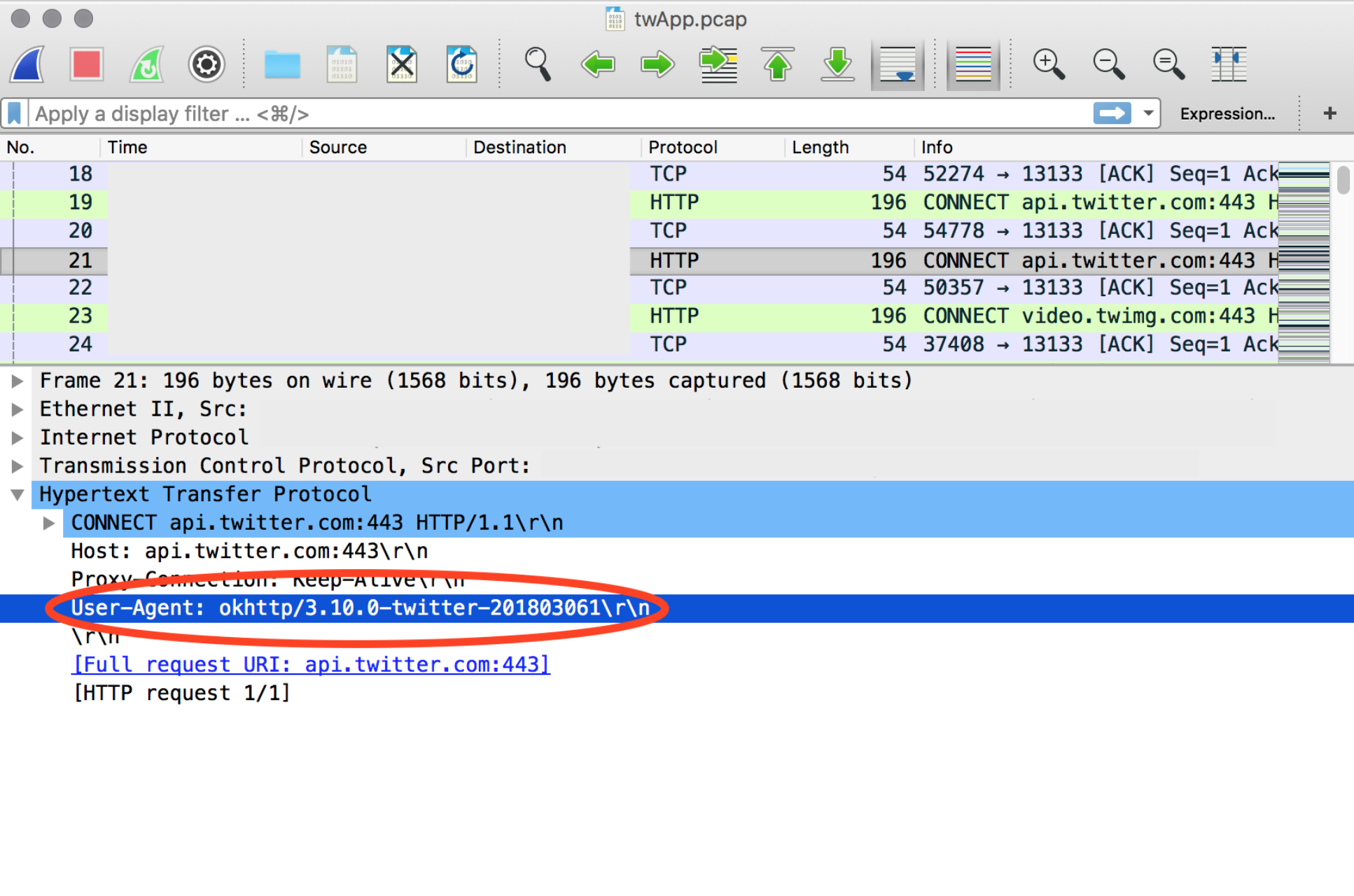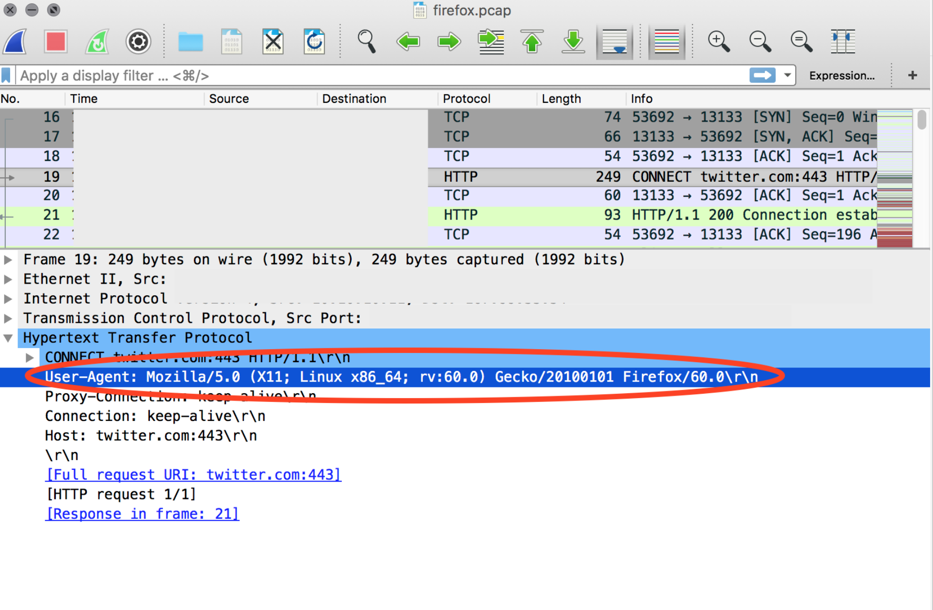 برای اینکه ببینیم سیستم سانسور از کجا تشخیص میدهد که کاربر از چه طریقی به توییتر وصل شده، بستههای اطلاعاتی از دو طریق (اپلیکیشن و مرورگر) را روی فایل ضبط و نتایج را با هم مقایسه کردیم. با مقایسه دو فایل به این نتیجه رسیدیم که اطلاعات ارسال شده از دو برنامه مشابهاند، تنها اختلاف این دو در هدر (header) ارسال شده درخواستِ اتصال به پراکسی بود. هدر مزبور که User-Agent نام دارد، مخصوص شناساندن برنامهی درخواست کننده به سرور است. همینطور که در تصویر زیر میبینید این هدر در دو فایل مشابه نیست: