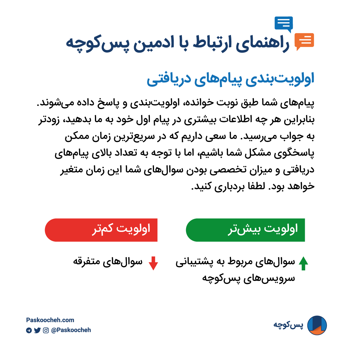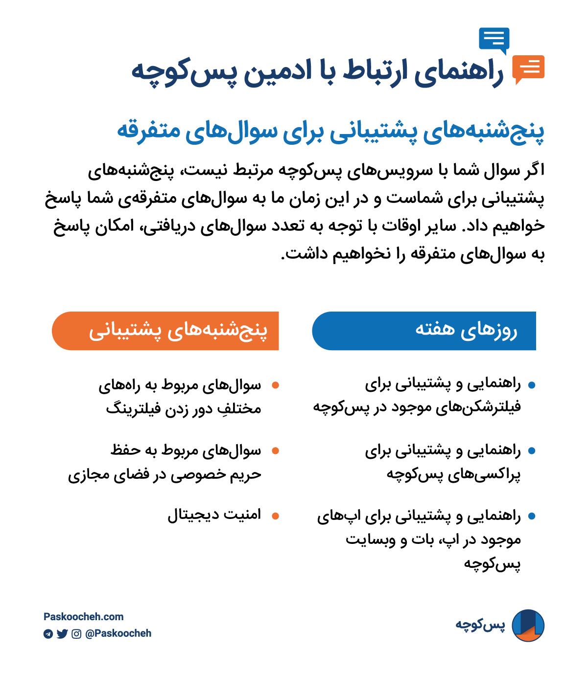 در زمانهای عادی، پیامهای مربوط به سرویسهای پسکوچه از اولویت بالاتری نسبت به پیامهای متفرقه برخوردارند. اگر سوال شما به مواردی خارج از پشتیبانی سرویسهای پسکوچه مربوط است، پنجشنبههای پشتیبانی برای شماست. در این زمان ما به سوالهای متفرقه شما پاسخ خواهیم داد و سایر اوقات با توجه به تعدد سوالهایی که دریافت میکنیم، امکان پاسخ به سوالهای متفرقه را نخواهیم داشت.