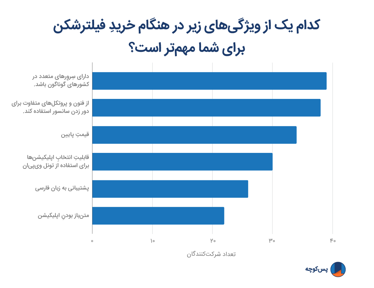 کسانی که مایل به پرداختِ حقِ عضویت بودند، در پاسخ به این پرسش که «کدام یک از ویژگیهای زیر در هنگام خریدِ فیلترشکن برای شما مهمتر است؟»، شش ویژگی مهمِ زیر را عنوان کردند (توجه داشته باشید که شرکتکنندگان امکان انتخاب بیش از یک گزینه را داشتند):