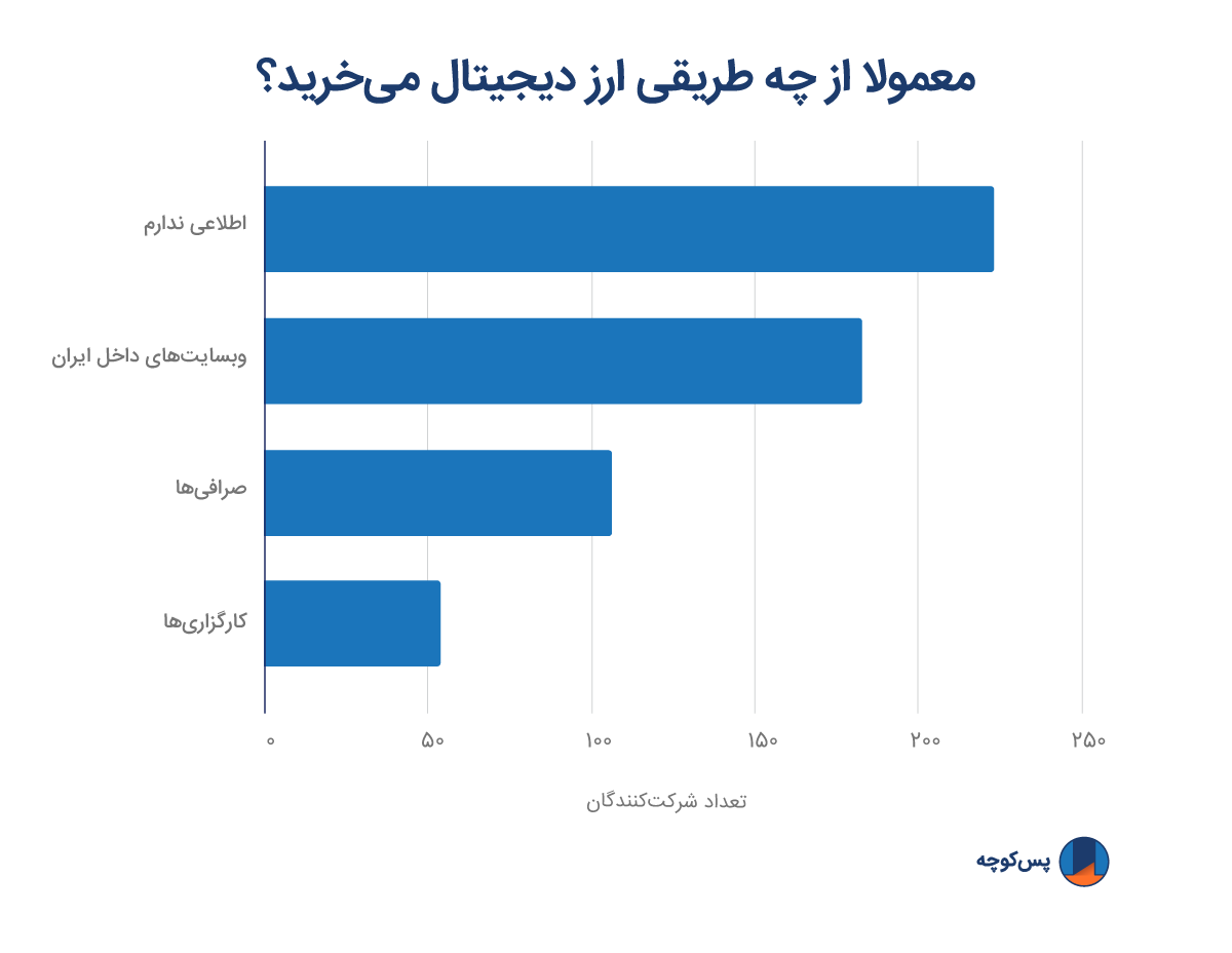 در پاسخ به این سوال که "معمولا از چه طریقی در ایران ارز دیجیتال میخرید؟"، و با توجه به اینکه شرکتکنندهها امکان انتخاب بیش از یک گزینه را داشتند، چهار نفر از هر دَه نفر پاسخ دادند که اطلاعی از چگونگیِ خرید ارز دیجیتال در ایران ندارند.