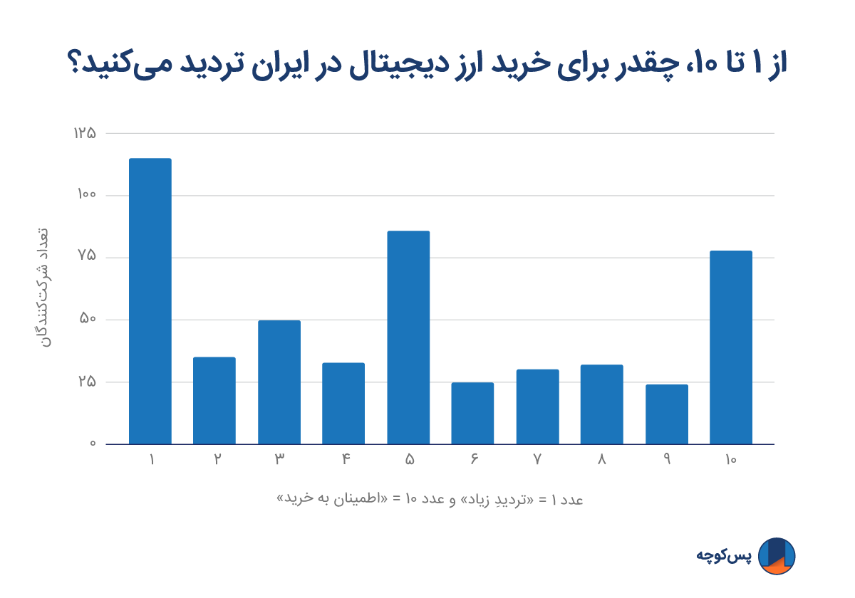علاوه بر این، پاسخ کاربران به این سوال که: "از یک تا ده، چقدر برای خرید ارز دیجیتال تردید میکنید؟" (عدد ۱ نمایانگر «تردیدِ زیاد» و عدد ۱۰ نمایانگر «اطمینان به خرید» بود)، نشان داد که حدود چهل و پنج درصد از شرکتکنندگان از خریدِ ارز دیجیتال میترسند.
