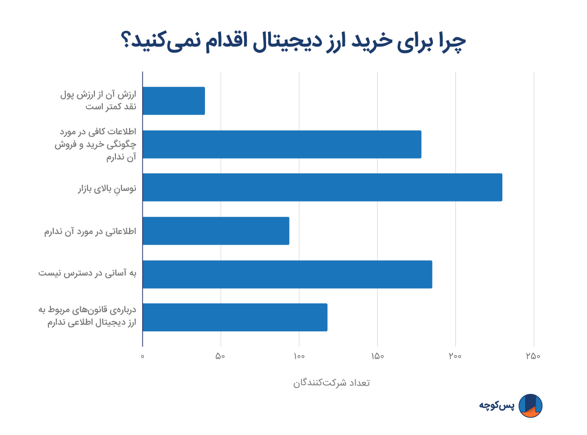 برای فهمِ بهترِ ترس و هراس شرکت کنندگان از خرید ارز دیجیتال، این سوال را مطرح کردیم: "چرا برای خرید ارز دیجیتال اقدام نمیکنید؟". با توجه به اینکه شرکتکنندگان امکانِ انتخابِ بیش از یک گزینه را داشتند، نتایج زیر به دست آمد: