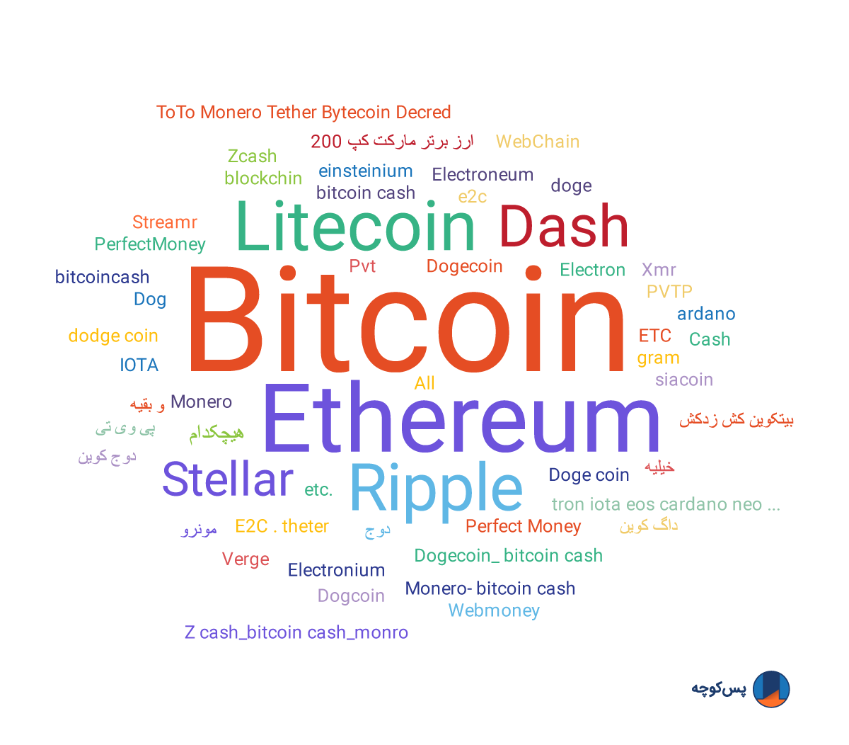 ابرواژهی زیر از پاسخهای کاربران به این سوال درست شده است: "با کدام یک از ارزهای دیجیتال آشنایی دارید؟" با توجه به ابرواژه میبینید که بیشترین آشناییِ کاربران پسکوچه به ترتیب با بیتکوین (Bitcoin) و پس از آن اِتِریوم (Ethereum)، لایتکوین (Litecoin)، ریپل (Ripple)، دَش (Dash) واستلار (Stellar) است.