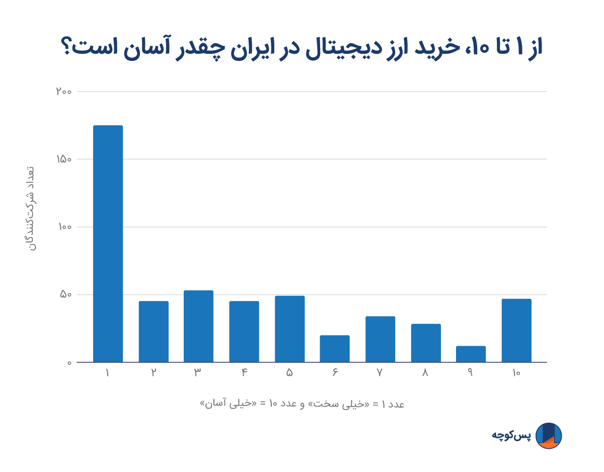 وقتی از کاربران پرسیدیم که "خرید ارز دیجیتال در ایران چقدر برای آنها آسان است؟" (عدد ۱ نمایانگر «خیلی سخت» یا «عدمِ اطلاع از چگونگیِ خرید» و عدد ۱۰ نمایانگر «خرید به آسانی» بود) و بعد از گروهبندی پاسخها بین عدد ۱ تا ۴ در میان کاربرانی که مشکل خرید داشتند، به این نتیجه رسیدیم که ۶۰ درصد از شرکتکنندگان برای خرید ارز دیجیتال با مشکل مواجهاند.