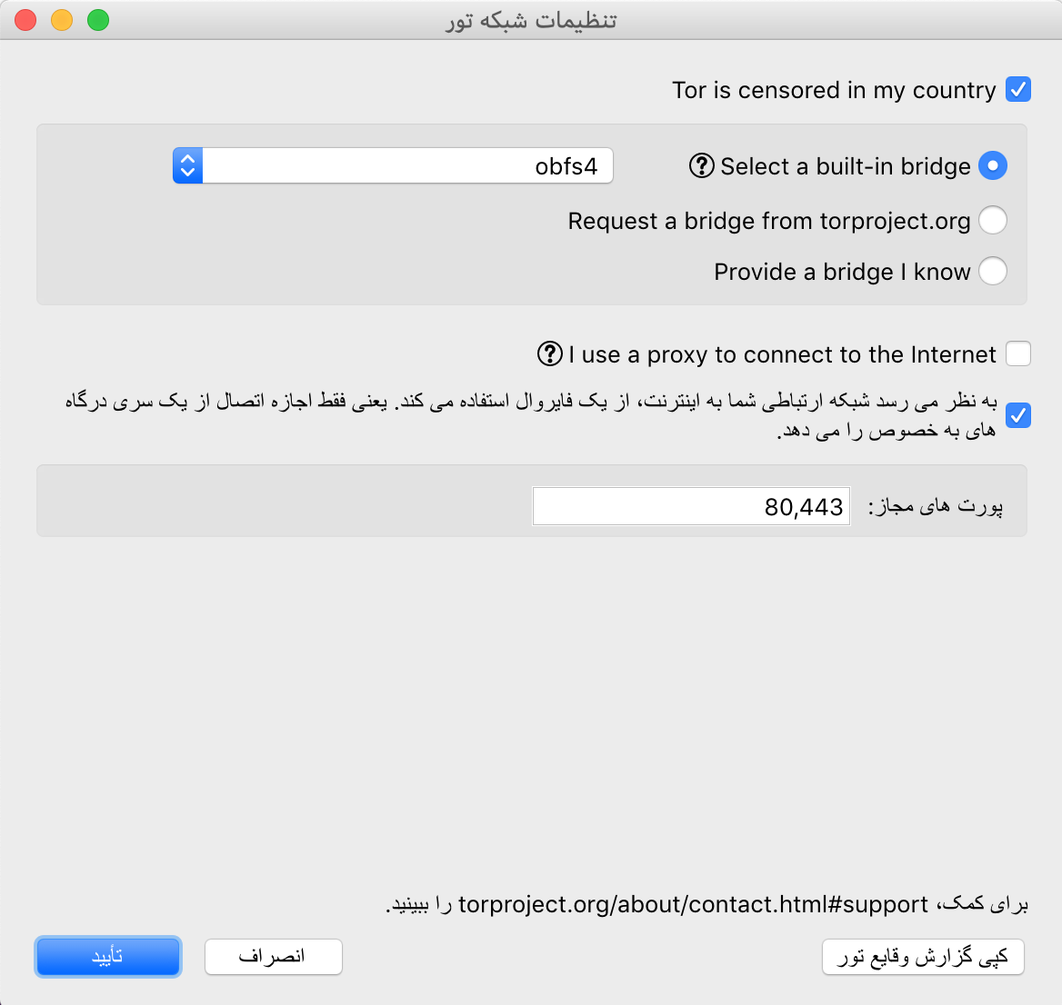 تنظیمات شبکهی تور برای کاربرانی ساخته شده که در محل سکونتِ آنها دسترسی به اینترنت آزاد توسط سرویسدهندهی اینترنت محدود شده است. این تنظیمات به کاربران ساکنِ ایران پیشنهاد میشود.