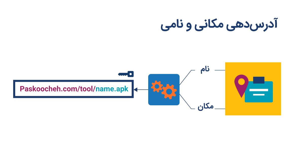 در آدرسدهی مکانی و نامی کلمهی نوشته شده بر روی رسید شما که در پیدا کردنِ کت و شلوار به متصدی کمک میکند در واقع محل کت و شلوار را نشان میدهد. ممکن است به طور مثال بر روی رسید این عبارت نوشته شده باشد: «کت و شلوار آقای زروان در طاقچهی شمارهی ۱۹». متصدی خشکشویی با دیدن این آدرس به طاقچهی شمارهی ۱۹ رفته و کت و شلواری که روی آن نوشته شده «آقای زروان» را میآورد. این حالت که آدرس کت و شلوار به محل طاقچه بستگی دارد ممکن است مشکلاتی را ایجاد کند. به طور مثال اگر کت و شلوار به یک طاقچهی دیگر منتقل شود و یا شخصی دیگر هم با نامِ "آقای زروان" یک کت و شلوار دیگر آورده باشد، پیدا کردن آن به مشکل برخواهد خورد.