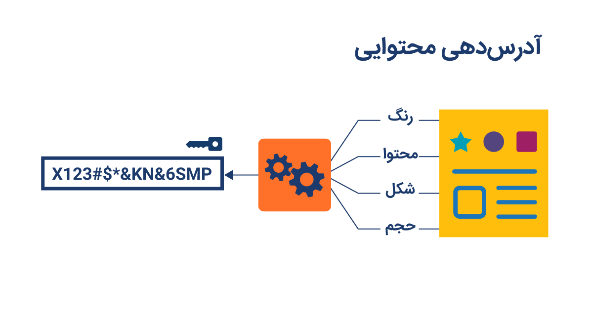 اما در آدرسدهی محتوایی کلمهی نوشته شده روی رسید شما بر اساس محتوا (در این مثال ابعاد، جنس، نوع و دیگر مشخصاتِ کت و شلوار) خواهد بود. مثلا روی رسید نوشته "ک.م.ن.چ.ج.س.۵۲.پ.آ.آ" که در زبان خشکشوییها یعنی "کت و شلوار مشکی نخی چهار جیب سایز ۵۲ پارگی آرنج آستین". متصدی نقشهی لباسها را نگاه کرده و طبقِ نقشه، آخرین محلِ "ک.م.ن.چ.ج.س.۵۲.پ.آ.آ" طاقچهی شماره ۱۹ است. به این ترتیب متصدی به راحتی کت و شلوار را پیدا کرده و به شما تحویل میدهد. دقت کنید که در این نوع آدرسدهی، آدرس کت و شلوار شما دائما به محض تغییر بهروز میشود.