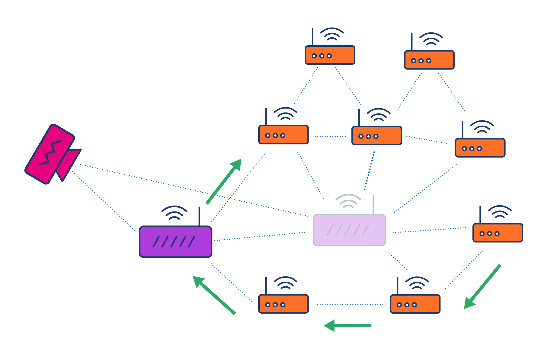 هنگامی که دوستتان متنی را برای شما ارسال میکند، اگر یکی از گرهها کار خود را متوقف کند، شبکهی مش سازگار میشود تا اطمینان حاصل کند که شما پیام را حتما دریافت میکنید.