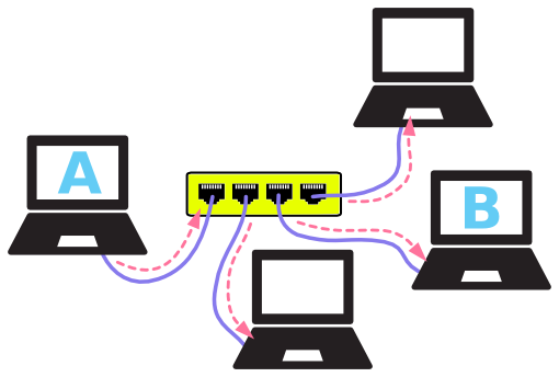 با استفاده از سوئیچ، کامپیوتر A پیامی را به کامپیوتر B میفرستد - سایر کامپیوترها این پیام را نمیبینند. آن کامپیوترها میتوانند پیامهای دیگر را به طور همزمان و بدون دخالت ارسال کنند.