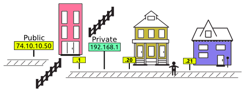 برای دیدن نمونهای از نحوهی استفاده از آدرسهای IP عمومی و خصوصی، اجازه دهید نگاه دیگری به خیابان 192.168.1 بیندازیم. ما یک ساختمان جدید در این خیابان داریم. آن ساختمان دارای یک آدرس IP عمومی و یک آدرس IP خصوصی است. همچنین حصاری وجود دارد که بقیه اینترنت را از دیدن و انتقال پیام به این آدرس در خیابان مسدود میکند.