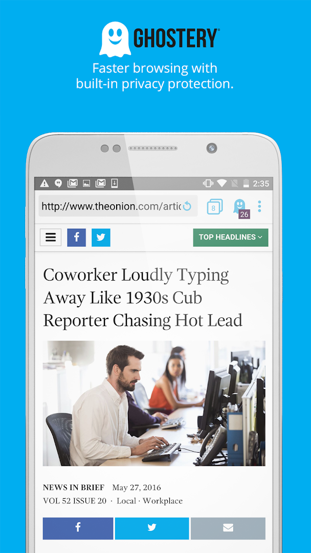 مرورگر Ghostery به شما کمک میکند میزانِ دسترسی شخص ثالث به دادههای شما (که از طریق ردیابها میسر میشود) را به حداقل ممکن برسانید و خود را محافظت کنید. و با حجمِ تنها ۲.۱ مگابایت، از مرورگرهای دیگر سبکتر است و در مصرفِ باتری دستگاهتان صرفه جویی میکند.